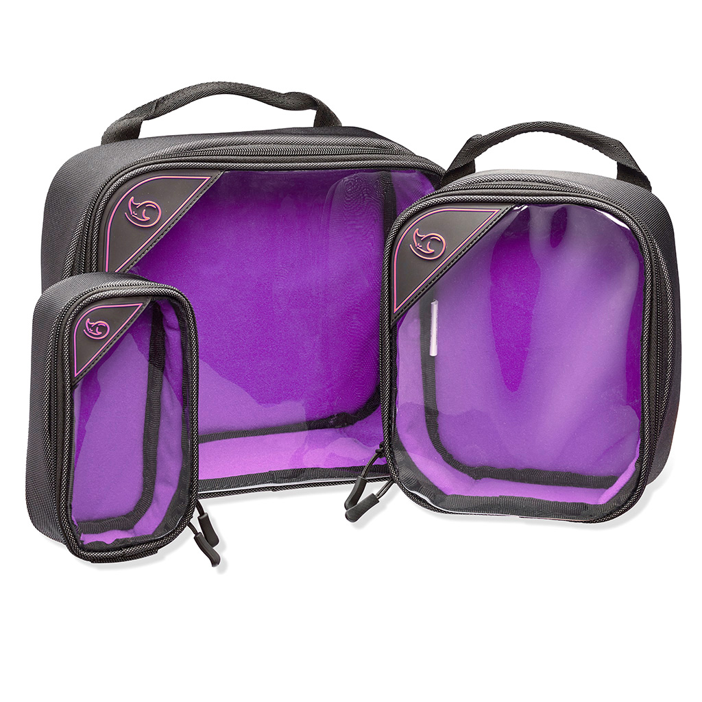 The KGBSETXP Stingray Gizmo-X, SET of 3 (L,M,S) Bags with transparent top-lid (Purple interior) from K-Tek is a multi-purpose bag with a see-through top-lid that provides compact organization of cables, adapters, wireless audio transmitters, batteries, lavaliere accessories, and more. It can be used as a utility transport or case in sound reinforcement for several on-set applications.